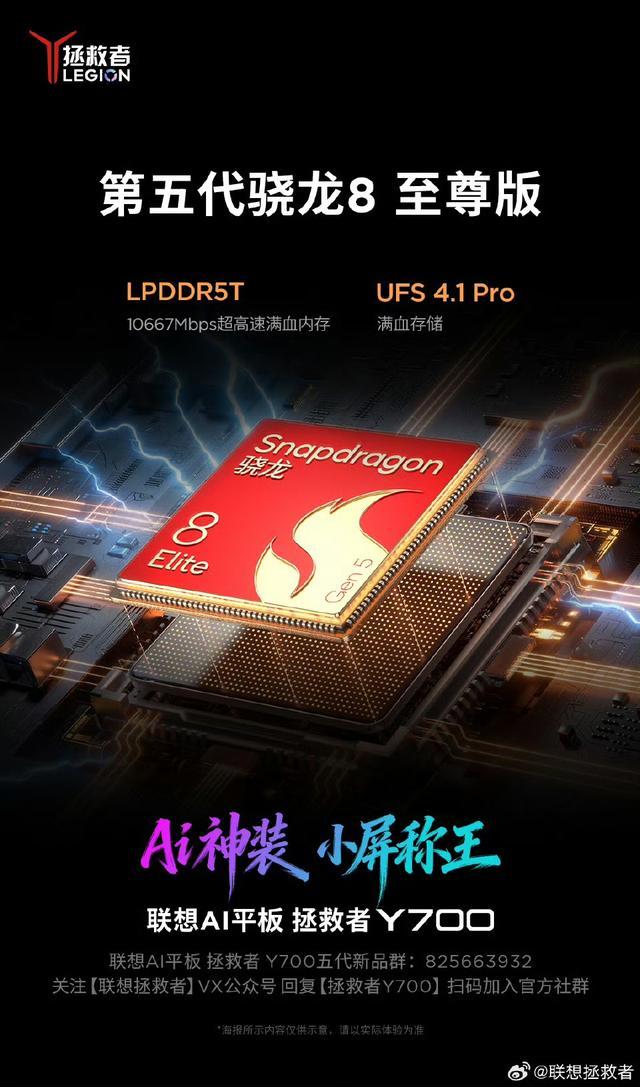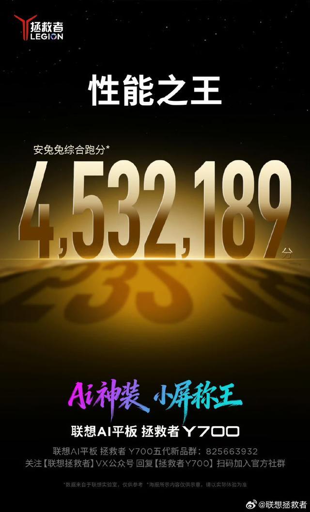 IT之家 3 月 2 日消息,联想今日官宣,AI 平板拯救者 Y700 搭载第五代骁龙 8 至尊版处理器,搭配 LPDDR5T+UFS 4.1 Pro,安兔兔综合跑分 4532189,官方宣传语喊出了“小屏称王”。