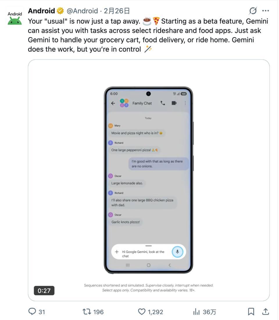 Gemini将具备主动操作手机的能力,这意味着AI助手不再只是回答问题的聊天机器人,而是能够真正理解用户意图、自主执行复杂任务的智能代理。当你对手机说“帮我中午预订常吃的那家披萨店,点老三样”,Gemini将能够自动打开订餐软件,选择门店、菜单,并完成支付,而无需用户一步步操作。这种“自动驾驶”式的交互体验,正在重新定义人机关系的边界。
